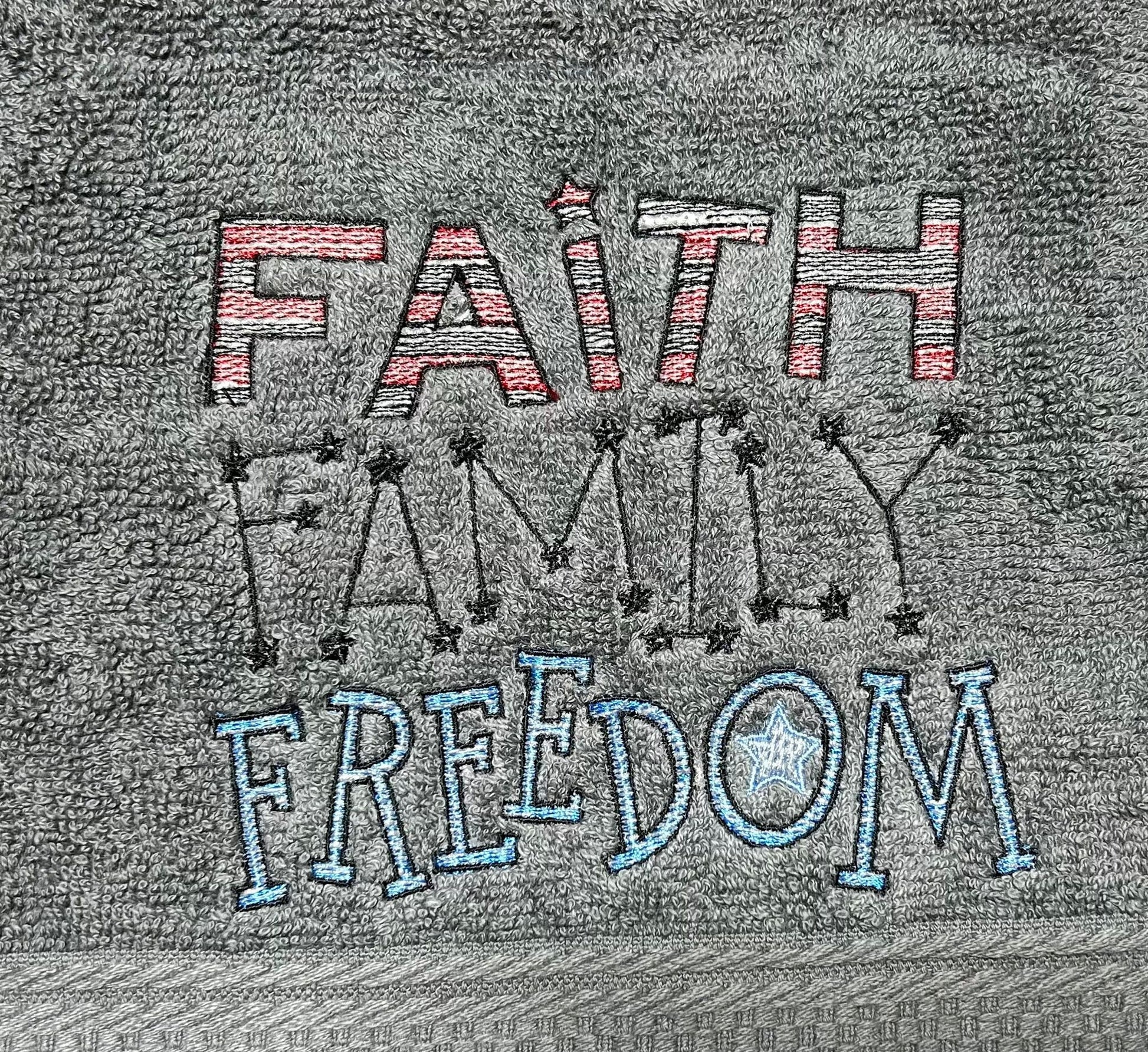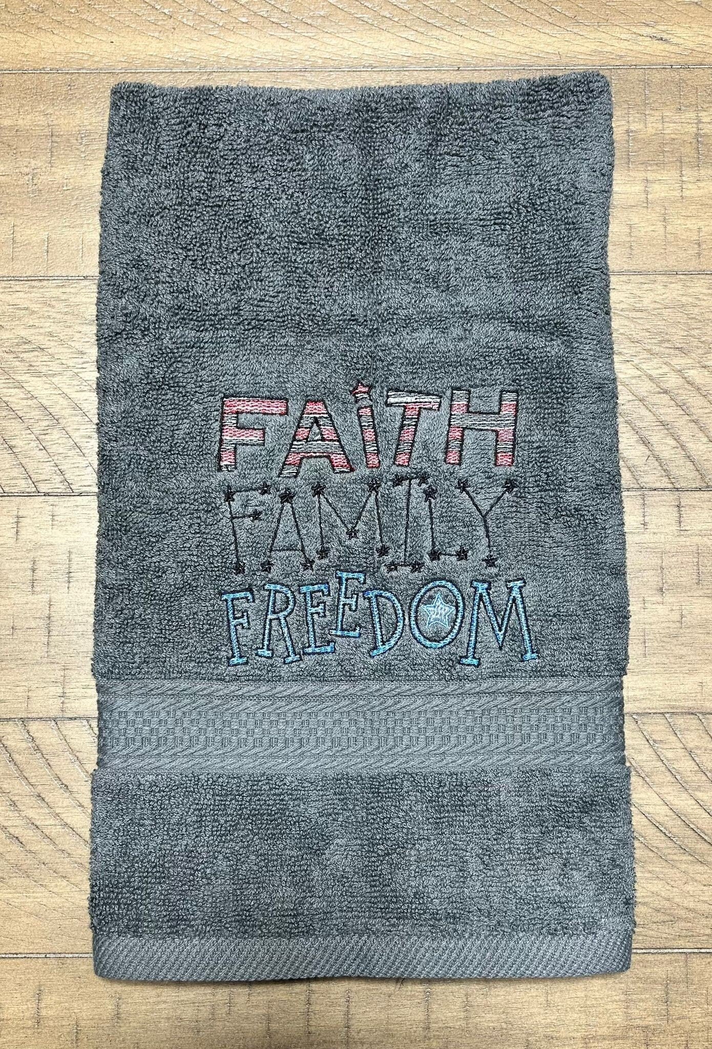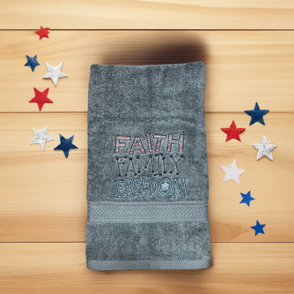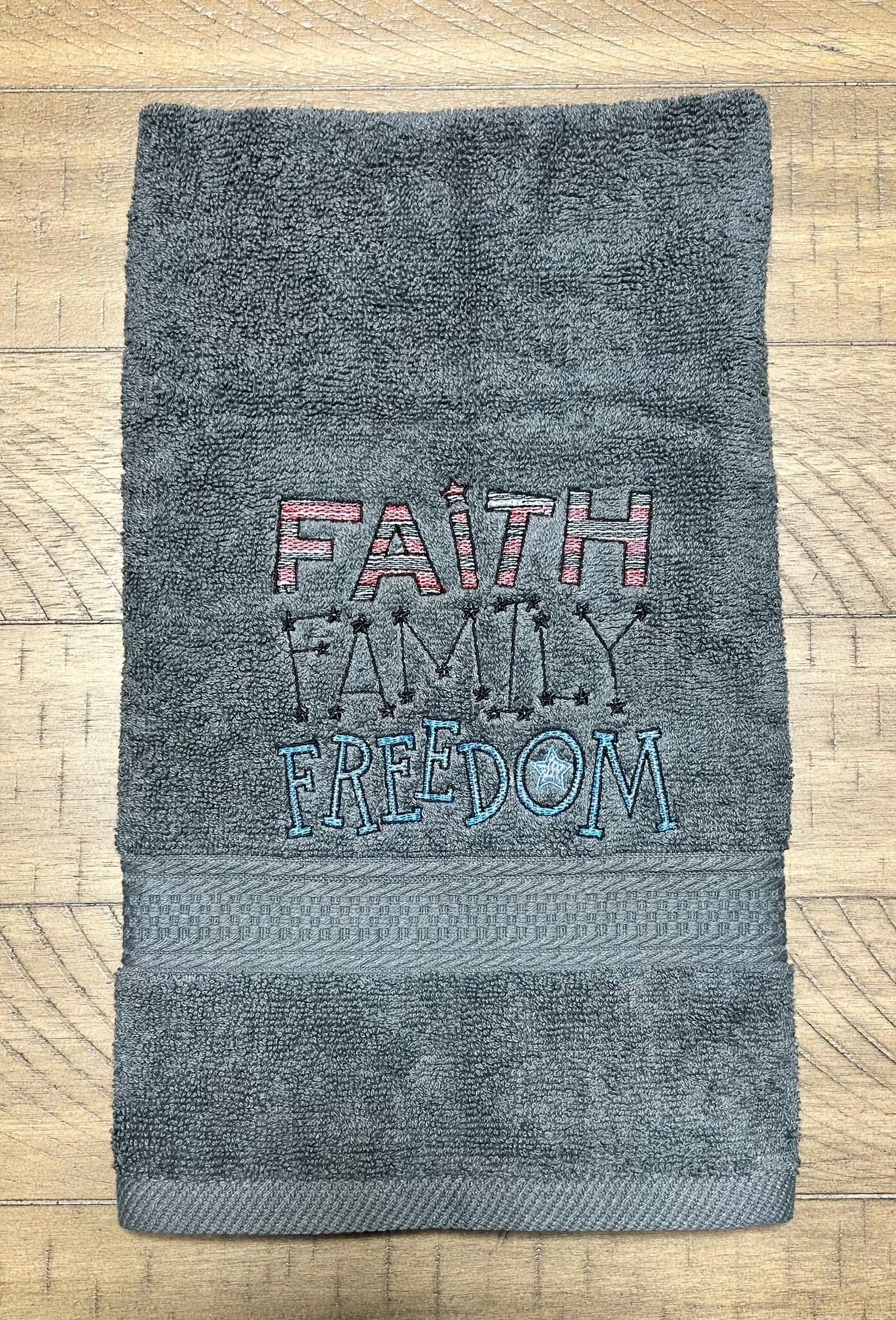 Beautiful White embroidered Hand Towel Faith Family Freedom. Summer vibes, Celebration, 4th of July, Memorial, Patriotic & Veteran's Day. These are great for gifts and home decor.