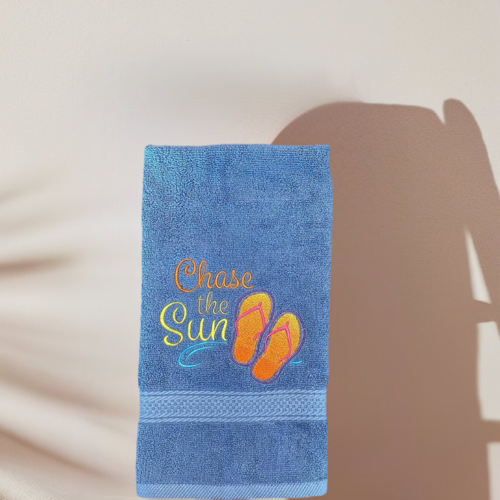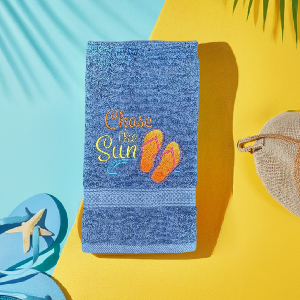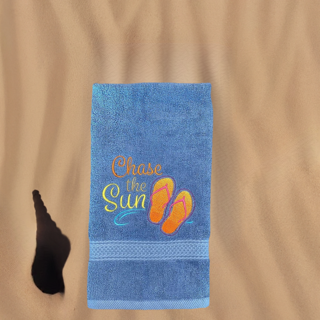 Beach Design Embroidered White Hand Towel. Chase the Sun. Beach Theme. Summer Vibes. Sun & Sand