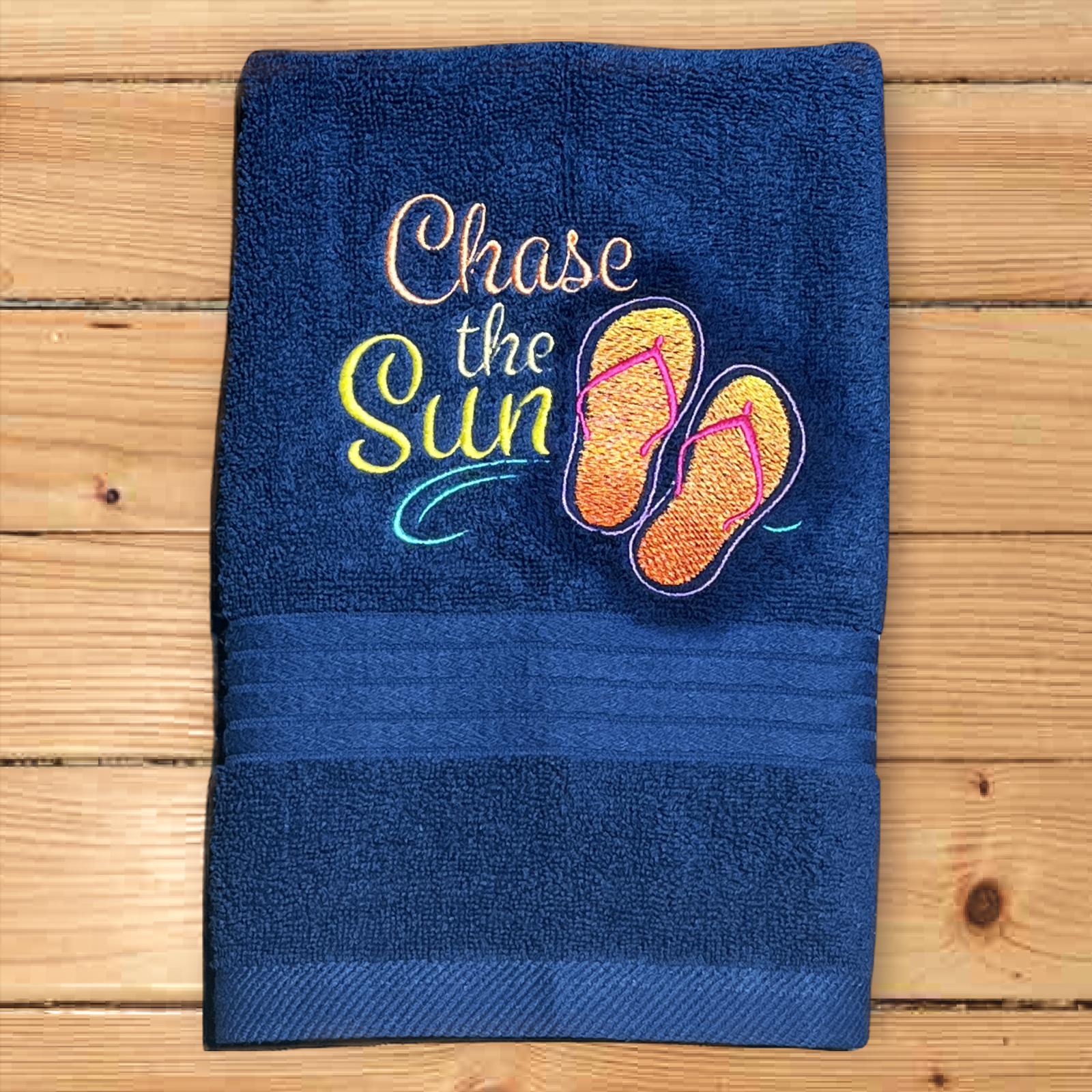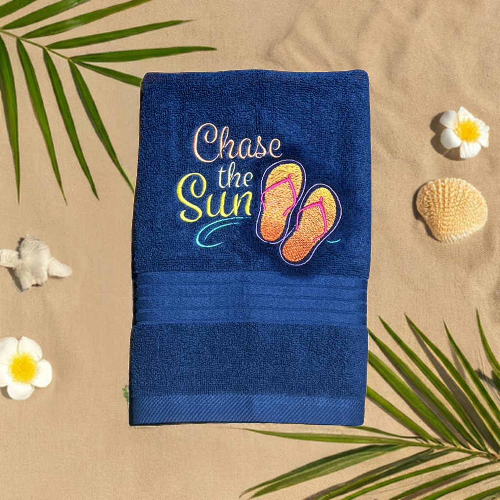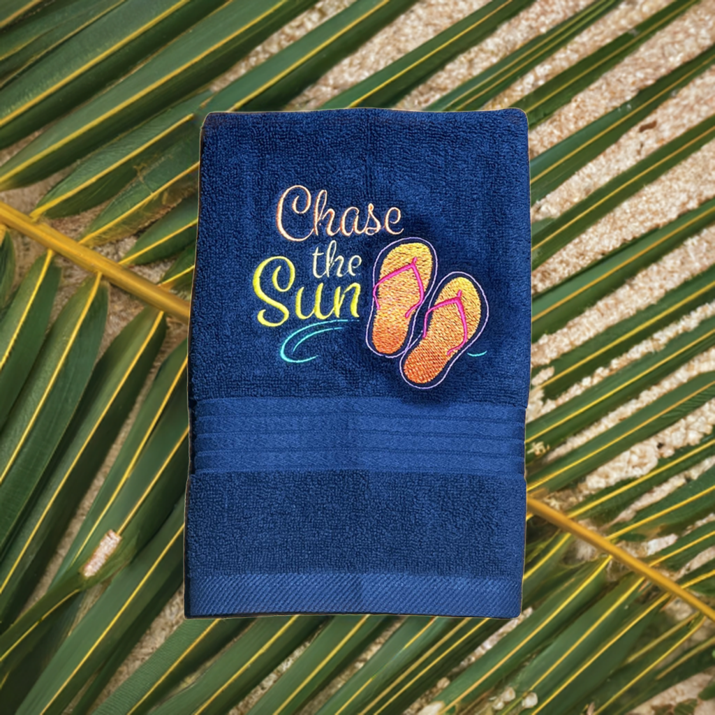 Beach Design Embroidered White Hand Towel. Chase the Sun. Beach Theme. Summer Vibes. Sun & Sand