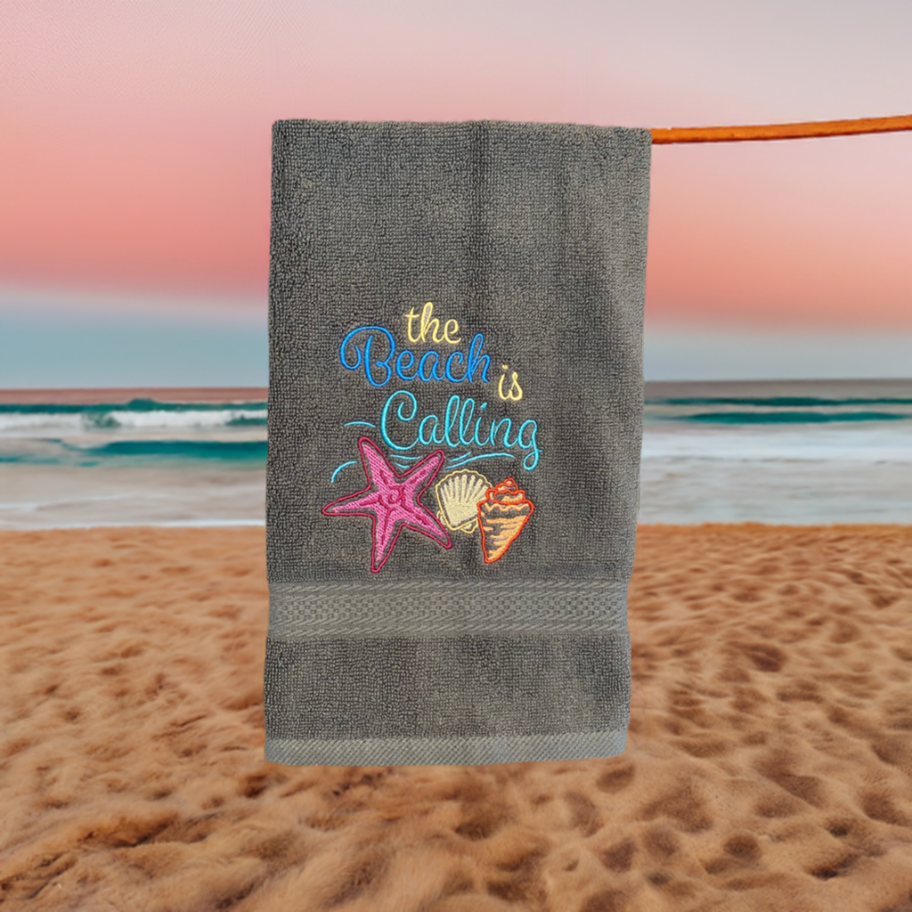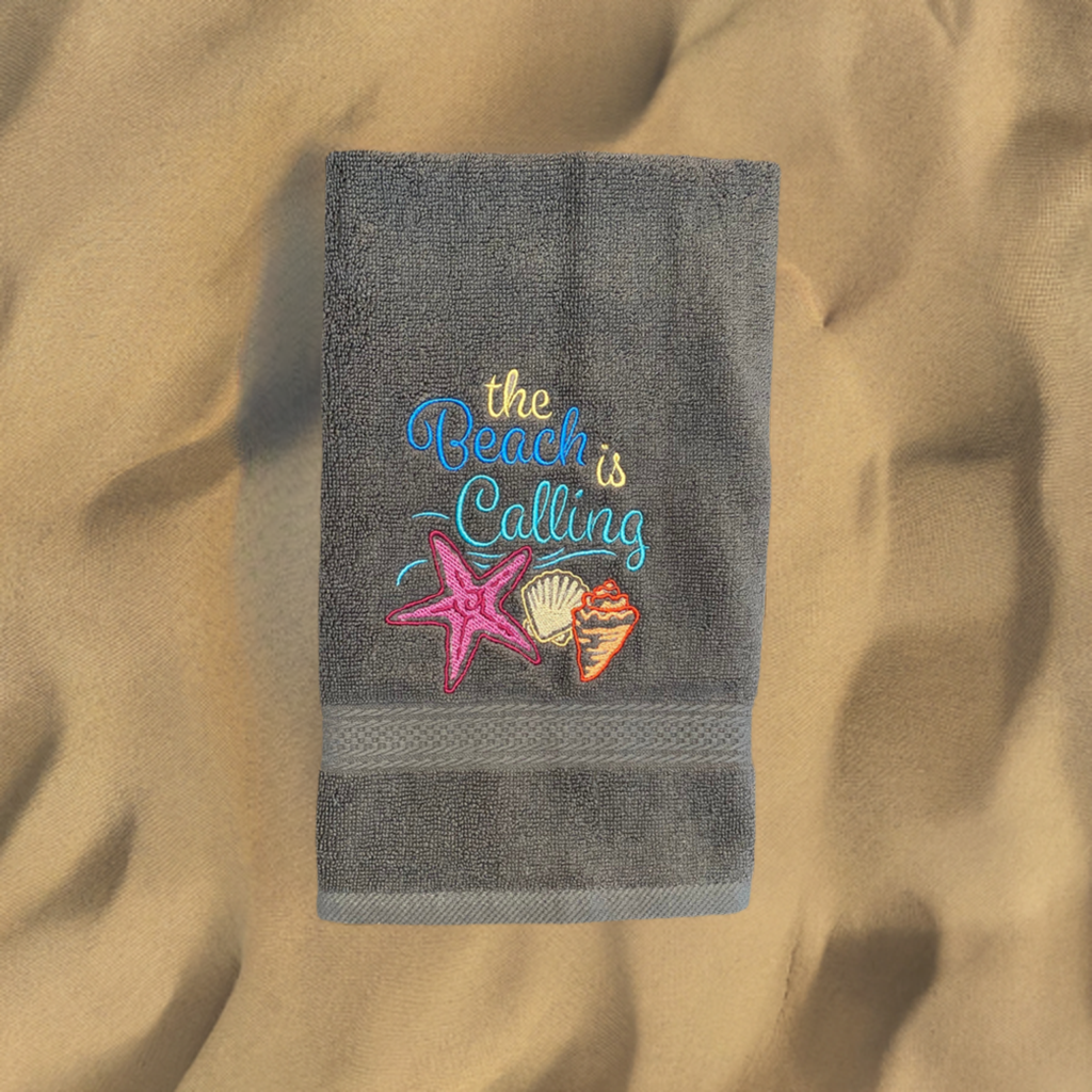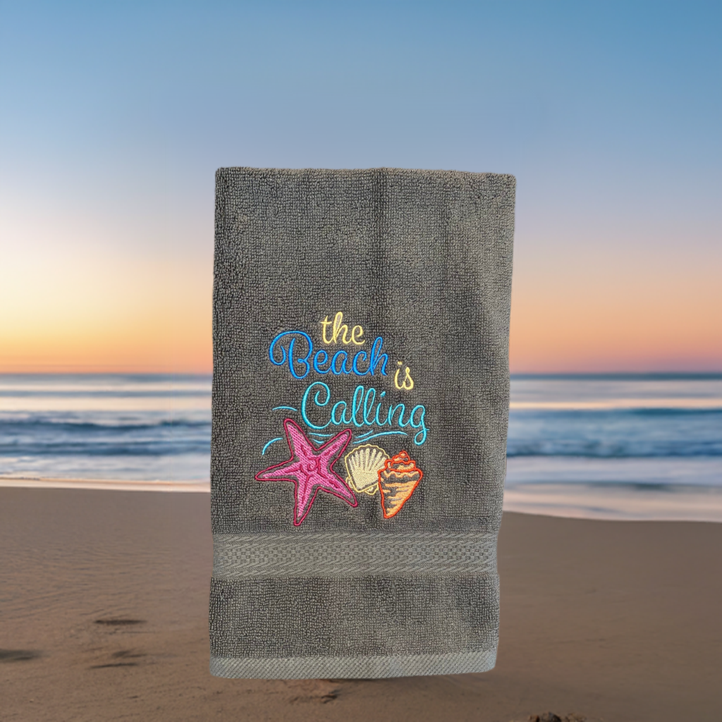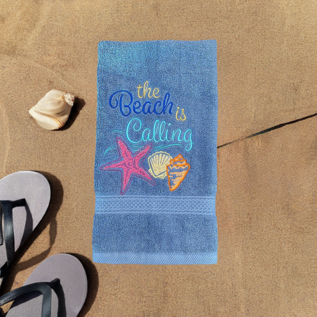 Beautiful White embroidered Hand Towel the Beach Is Calling. These are great for gifts.