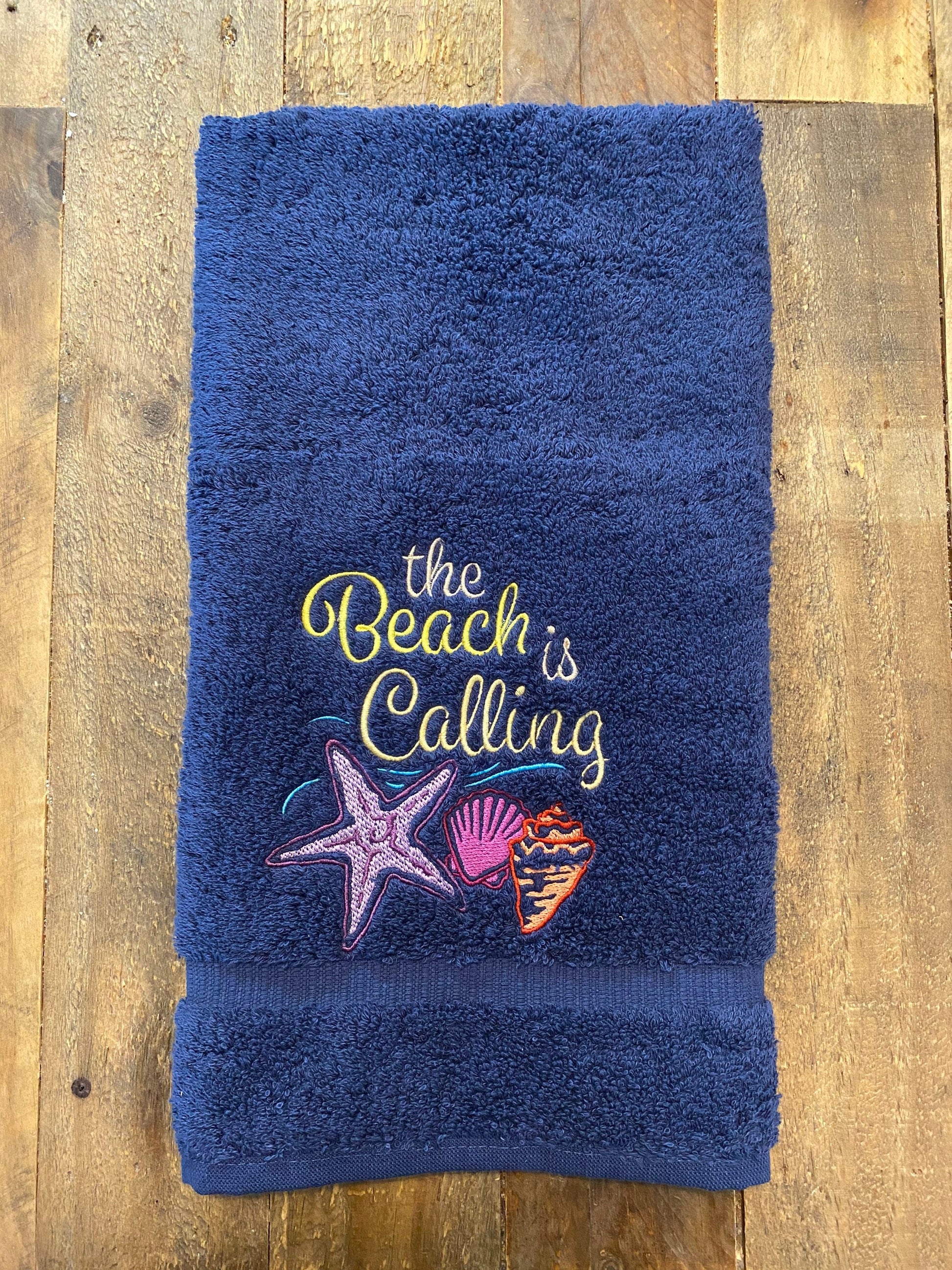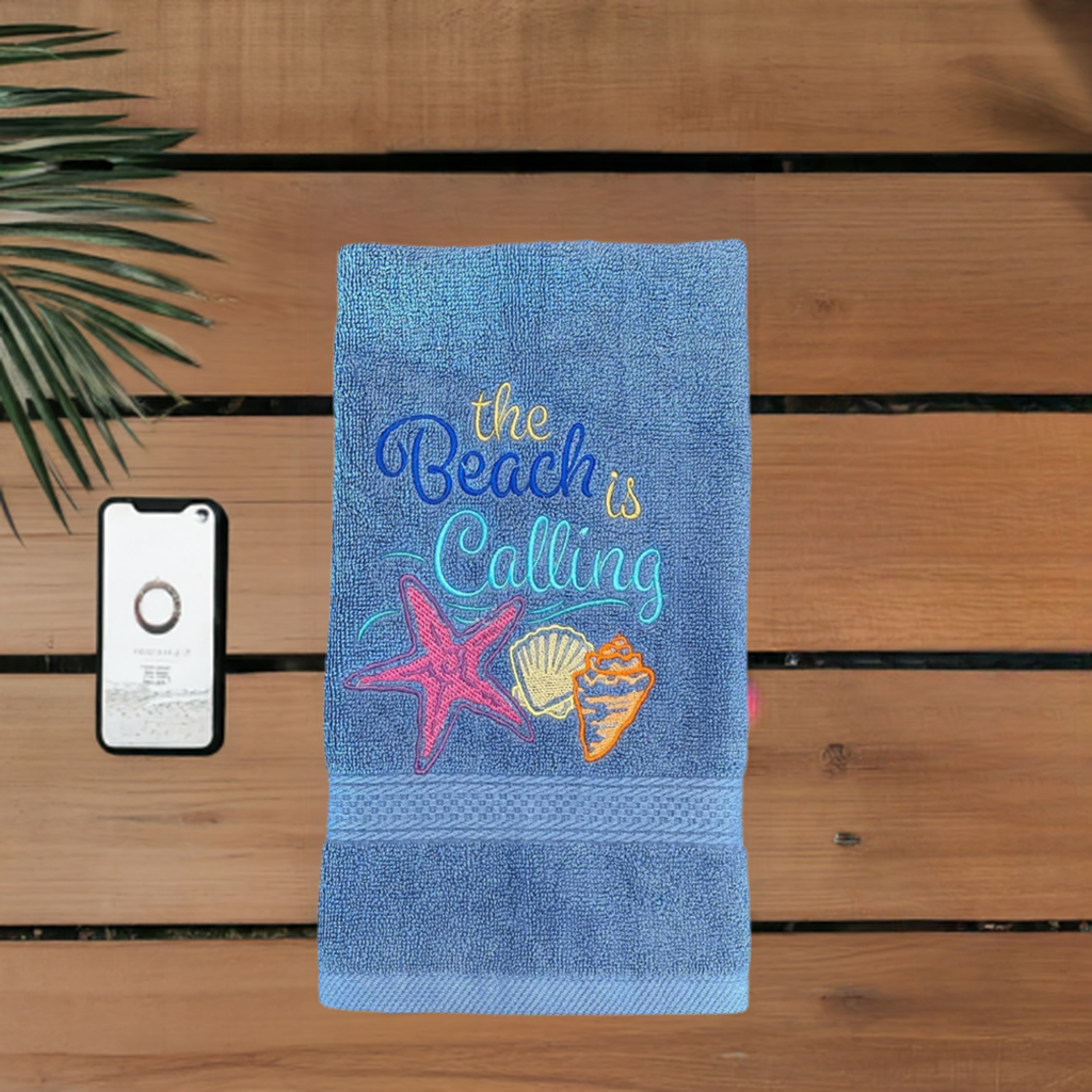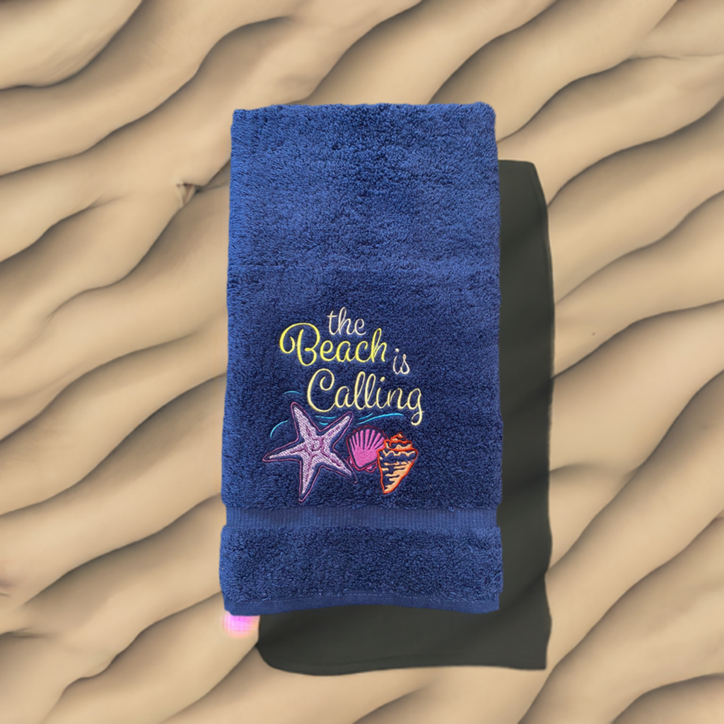 Beautiful White embroidered Hand Towel the Beach Is Calling. These are great for gifts.