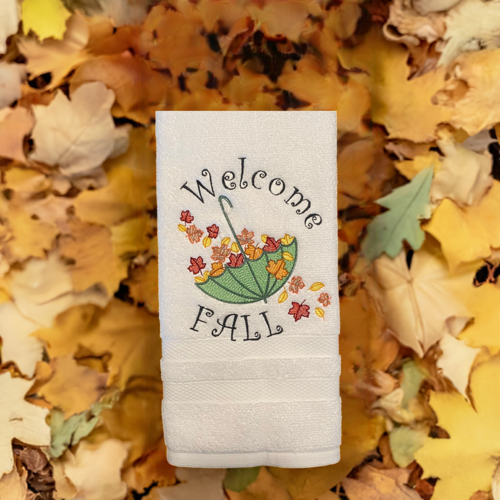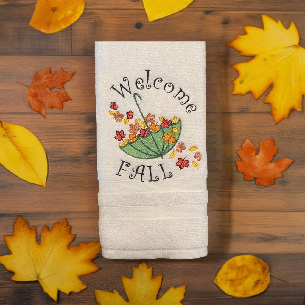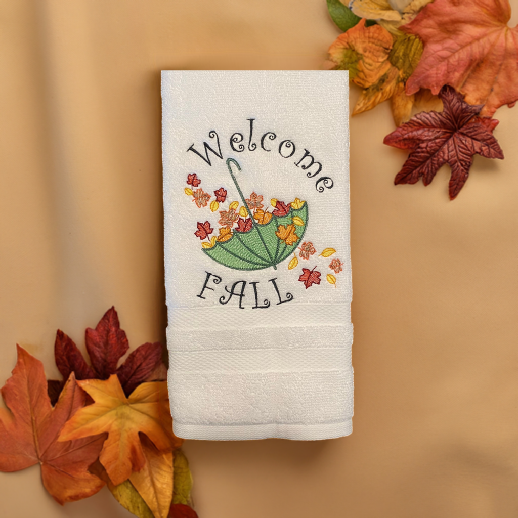 Fall Embroidered White hand Towel. Autumn Parasol, Welcome Fall Umbrella with autumn leaves.