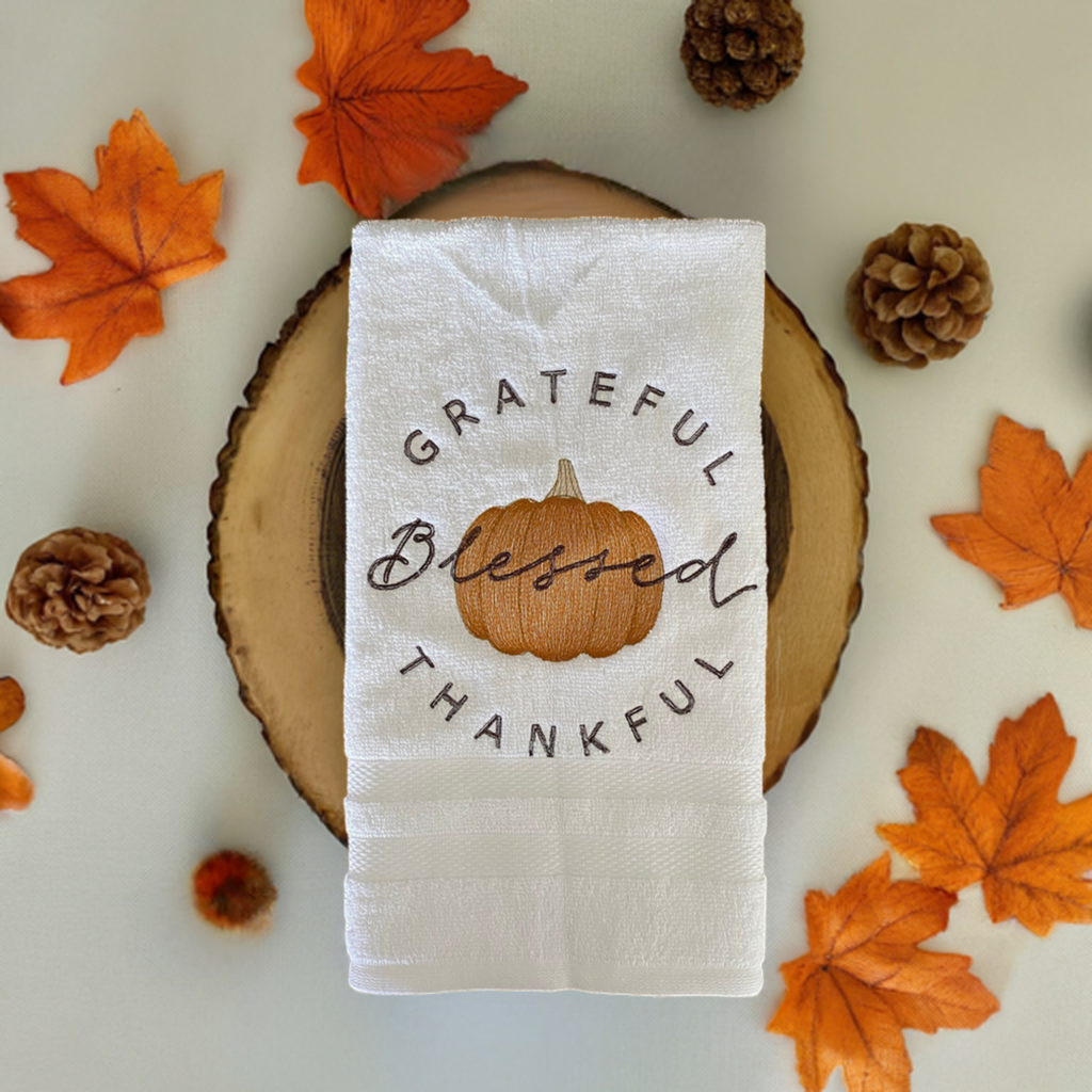 Fall Embroidered White hand Towel. Blessings Pumpkin , Autumn Parasol. Autumn Pumpkin & Fall Fun Crows.
