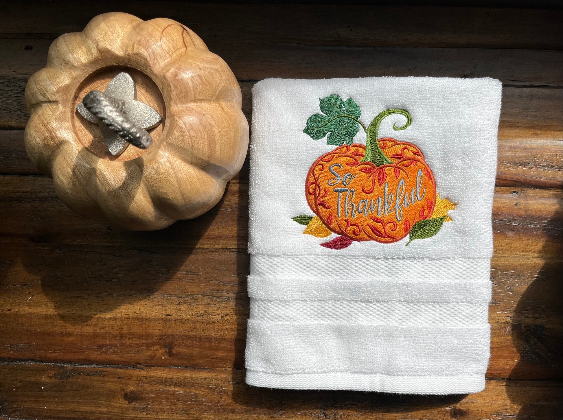 Beautiful embroidered Hand Towel “so Thankful Pumpkin”. These are great for gift or to décor for the Season.