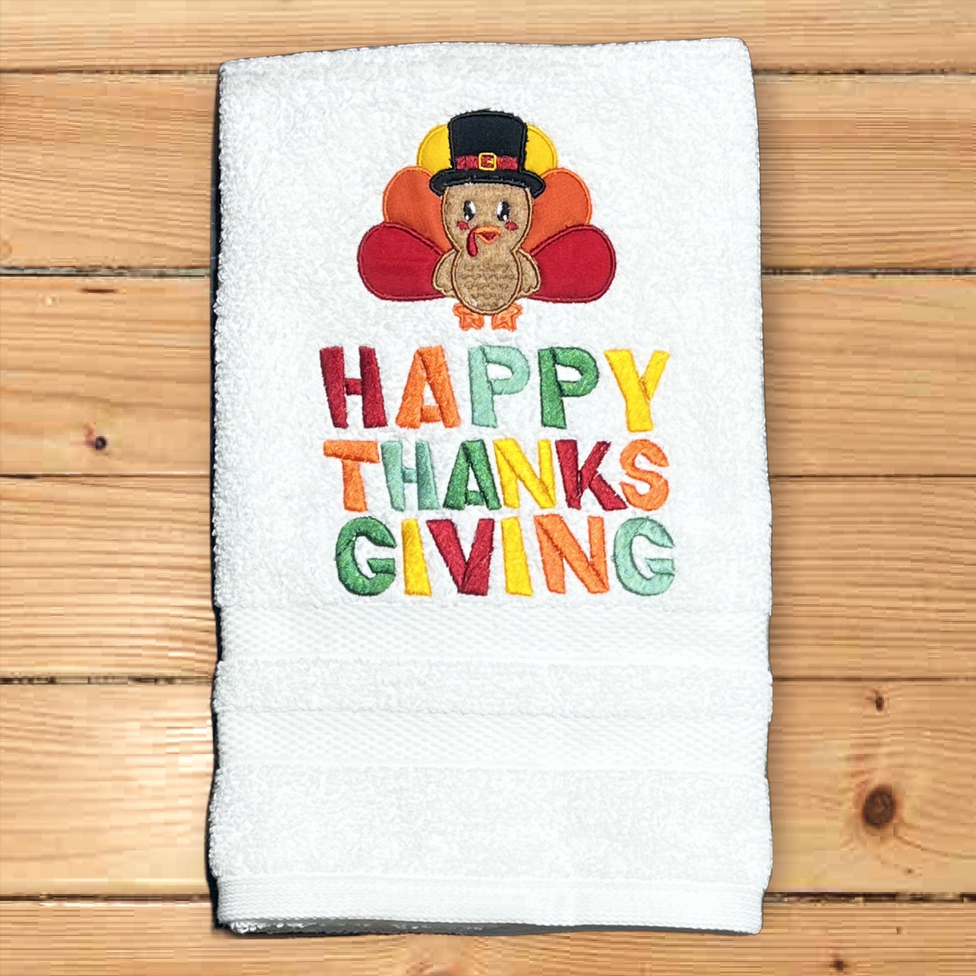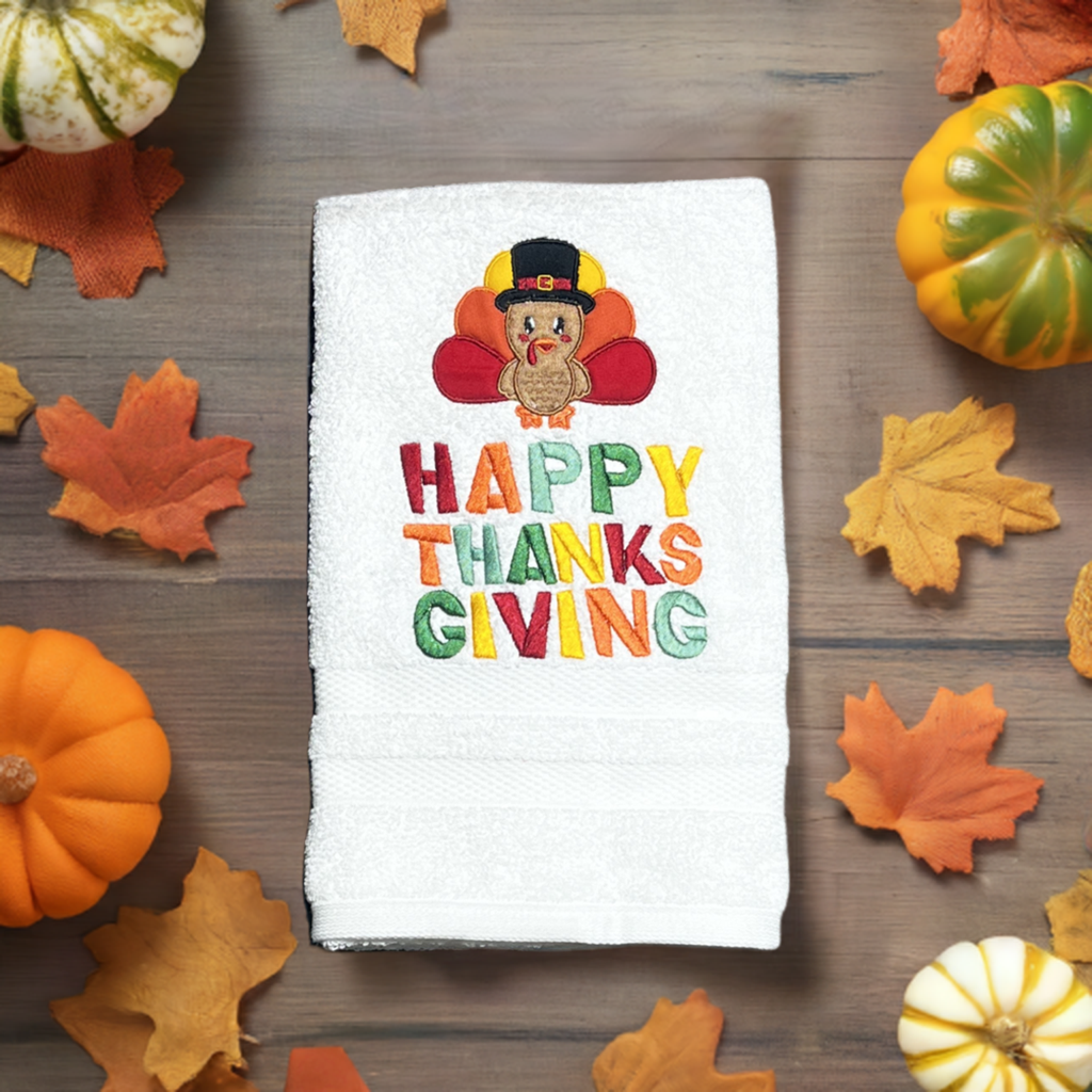 Fall Embroidered White hand Towel. Turkey - Happy Thanks Giving. Thanksgiving Autumn.
