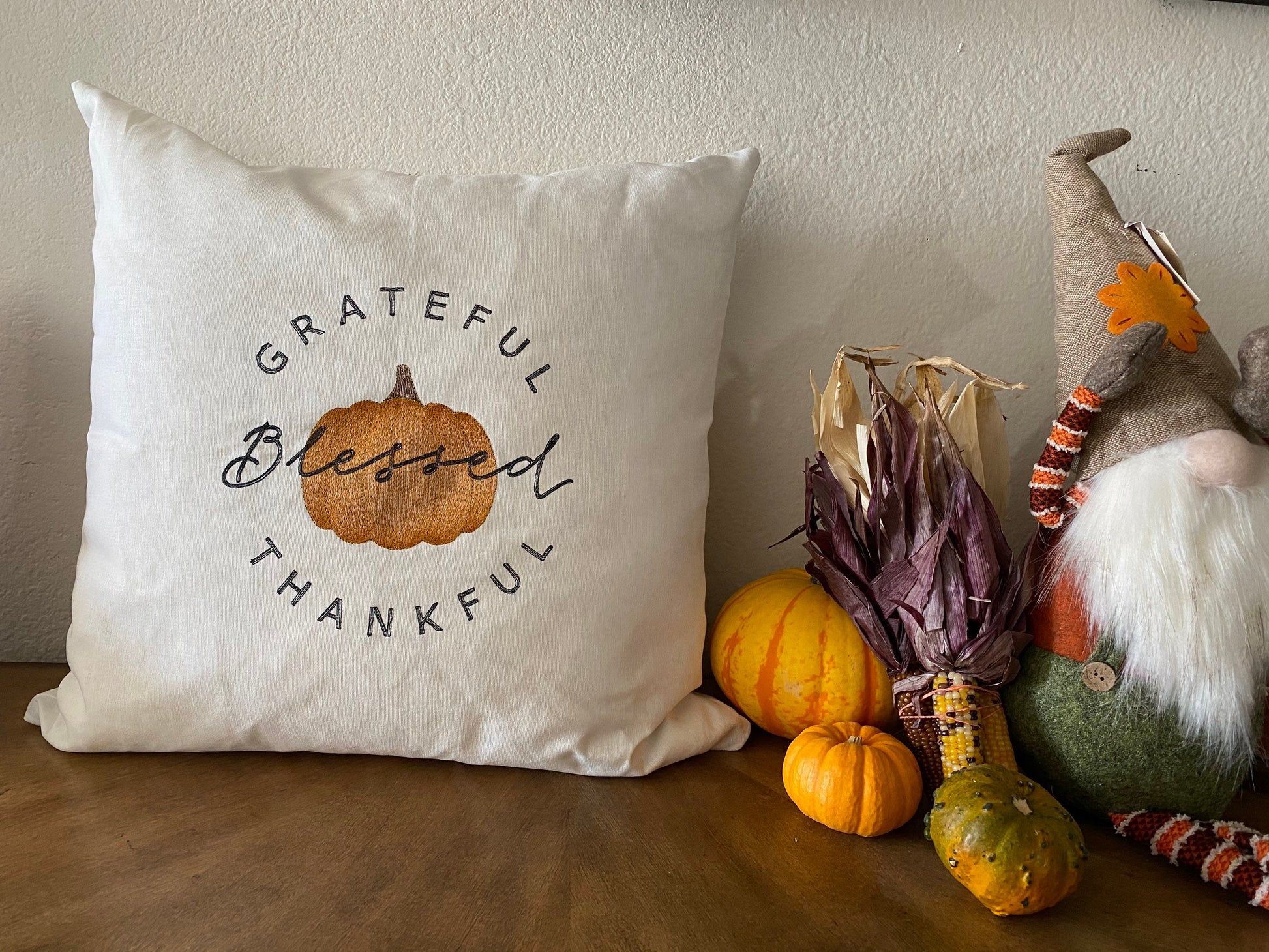 Fall Embroidered White Pillow Cover. Blessings Pumpkin , Grateful, Thankful and Blessed Pillow Cover
